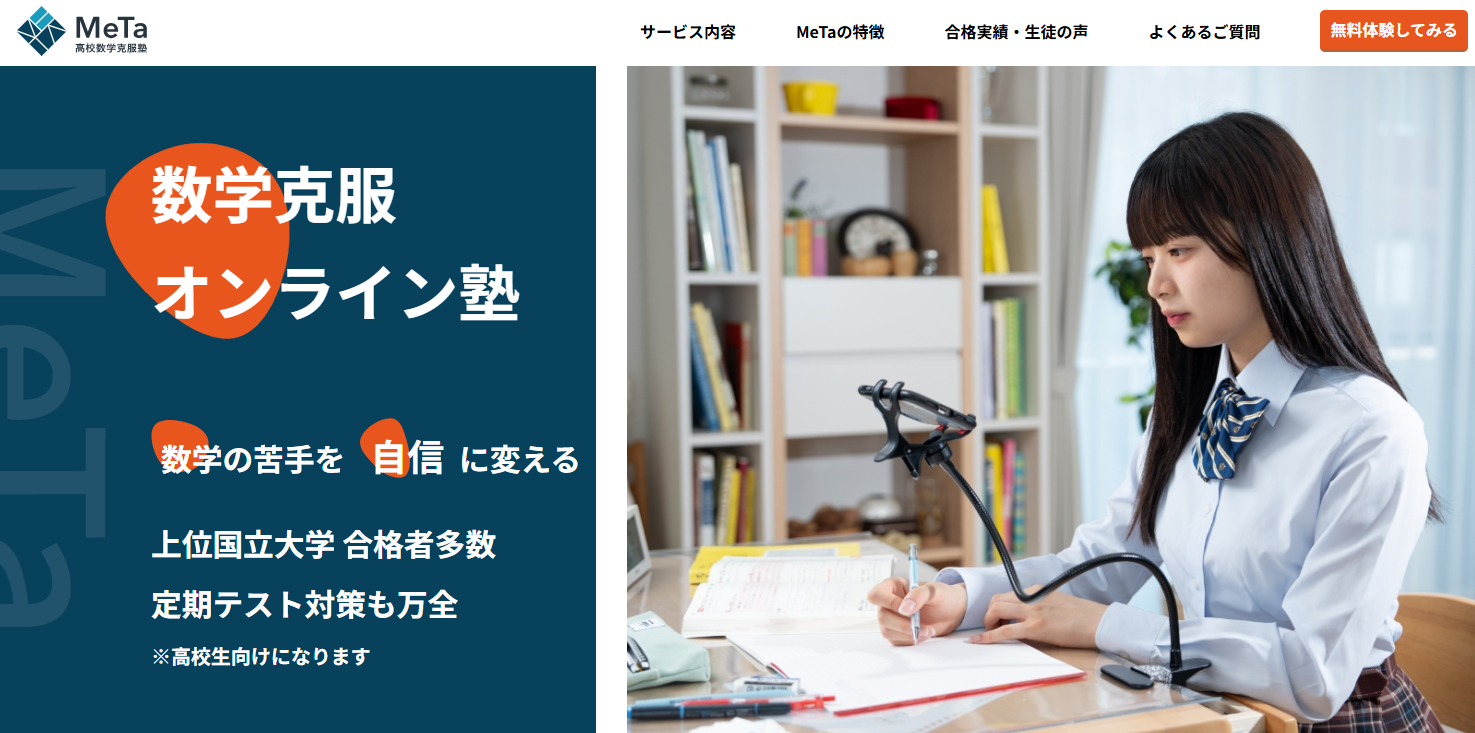 | 4 | MeTa | 数学専門・個別・オンライン | 苦手克服・思考整理をしたい人 | 対話型、言語化、オンライン運用 | 演習管理の具体性 |