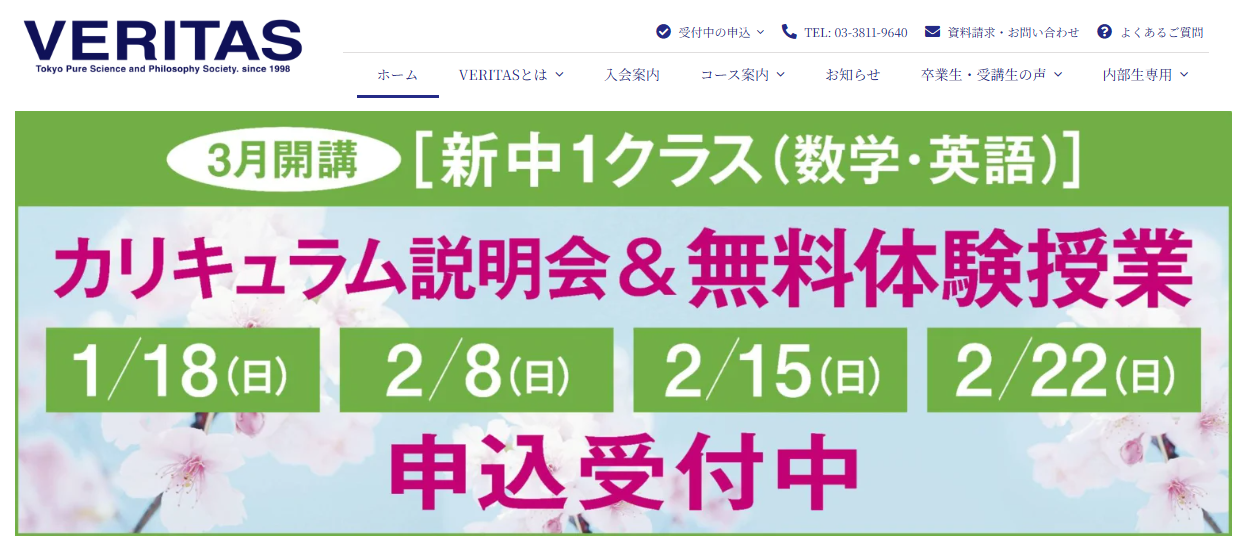 VERITASは「原理から学ぶ塾」として案内され、基礎コース・受験コース・集中授業などを展開しています。受験科の数学編でも、概念や背景を学びながら試行錯誤を重視する方針が見えます。講座型で、概念再構築を重視したい人には候補になりやすいタイプです。