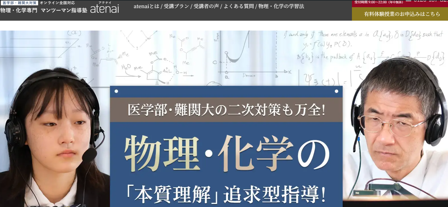 1 アテナイ 物理・化学専門・個別・オンライン対応 基礎から難関大まで一気通貫で伸ばしたい人。相性良ければ、化学も見てもらいたい人も〇 口頭試問、段階設計、思考力重視