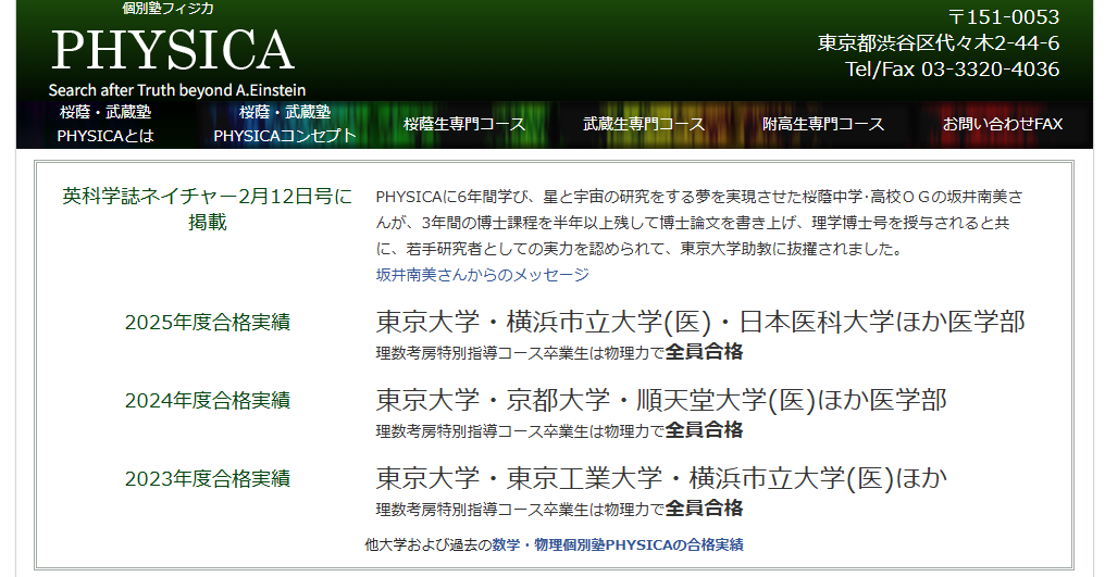 PHYSICAは、数学・物理に特化した個別・少人数型の塾です。単なる受験テクニックだけでなく、理数の見方そのものを育てる色合いがあり、中高一貫校生や高い抽象思考に耐えられる生徒と相性が良い印象です。